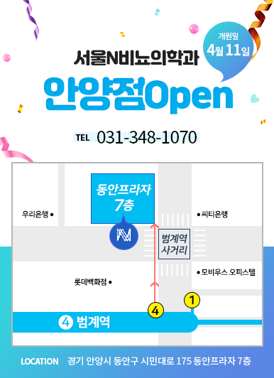 서울엔 안양점이 2022년 4월 11일부터 진료를 시작합니다. 페이지 정보 작성자 서울N 작성일22-03-21 15:05 조회1,104회 댓글0건 이전글 목록 본문 많은 관심과 성원 부탁드립니다. 감사합니다. 댓글목록 등록된 댓글이 없습니다. 이전글 목록